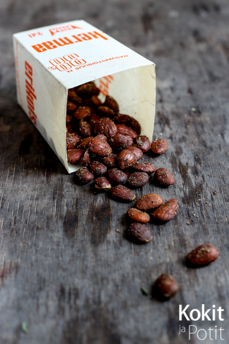 Paahda manteleita kuumalla pannulla koko ajan sekoitellen, kunnes ne ovat lämmenneet ja saaneet hieman paahteista pintaa. Lisää pannulle öljy tai voi. Sekoita. Lisää mausteseos ja suola. Sekoita. Tarjoa hieman haaleina tai huoneenlämpöisinä.